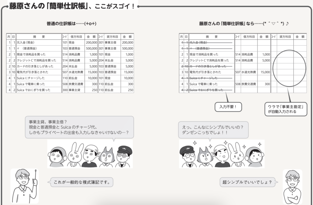 ずぼらの師匠・藤原さんが開発した簡単仕訳帳は、事業主貸・事業主借とか、入力しなくて済んで超シンプル! 私の青色申告の救世主です